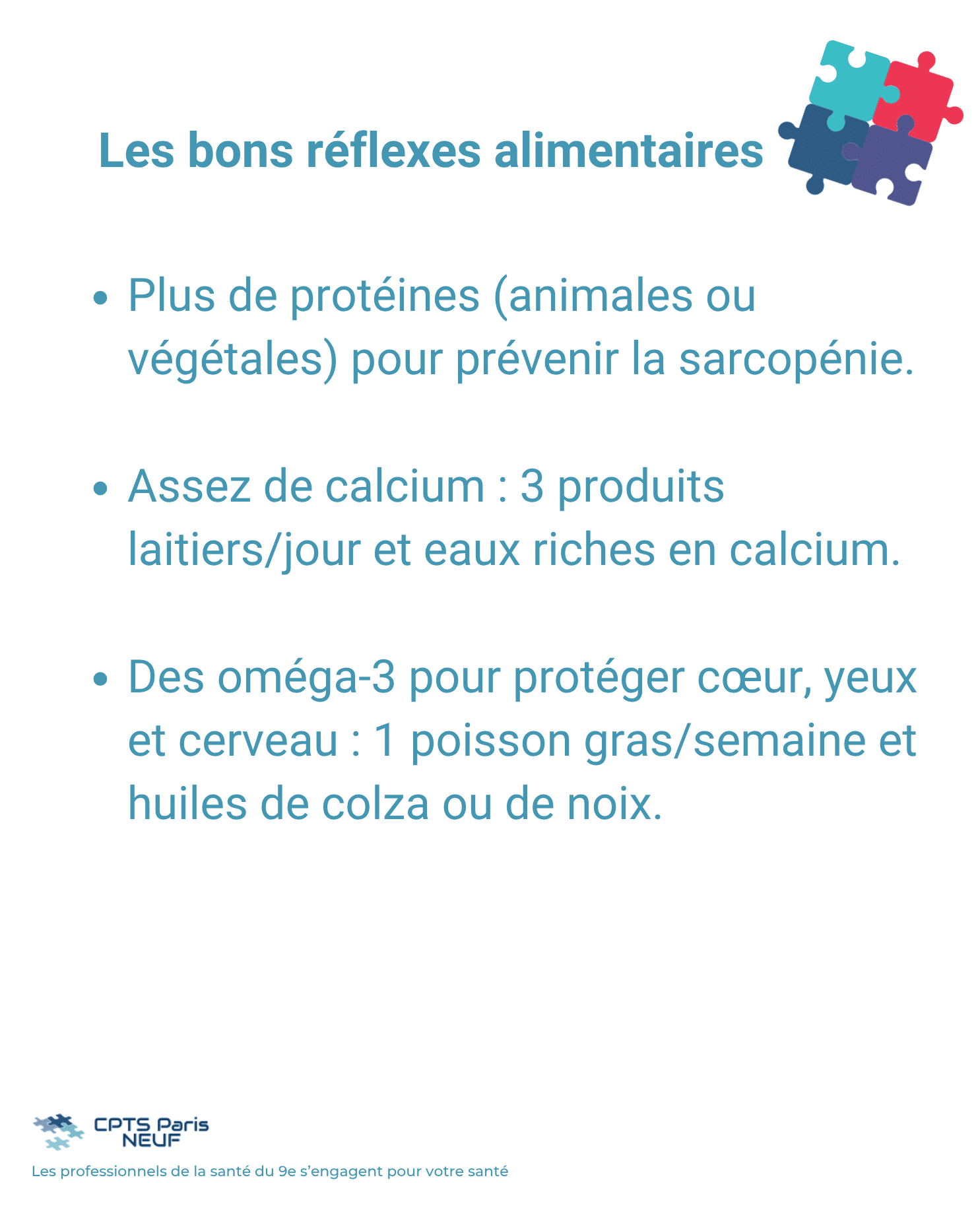 - Protéines (animales ou végétales) pour prévenir la sarcopénie