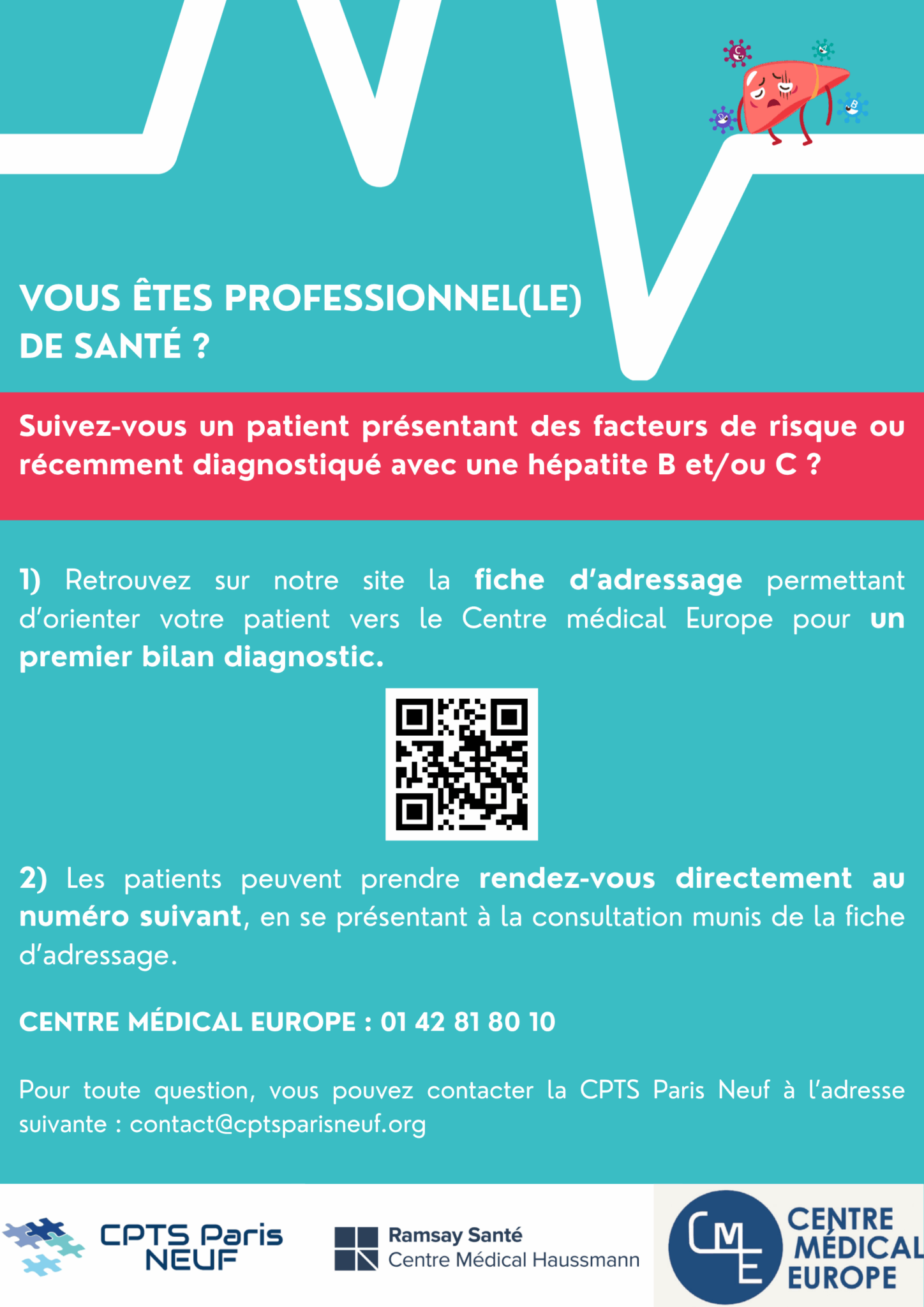 La CPTS Paris Neuf, en partenariat avec le Centre Médical Europe, propose un parcours de soins coordonné pour la prise en charge des hépatites B et C. Ce dispositif est destiné aux patients présentant des facteurs de risque et vise à favoriser un dépistage précoce, optimiser le diagnostic et assurer une prise en charge adaptée, tout en facilitant l’accès aux soins spécialisés.