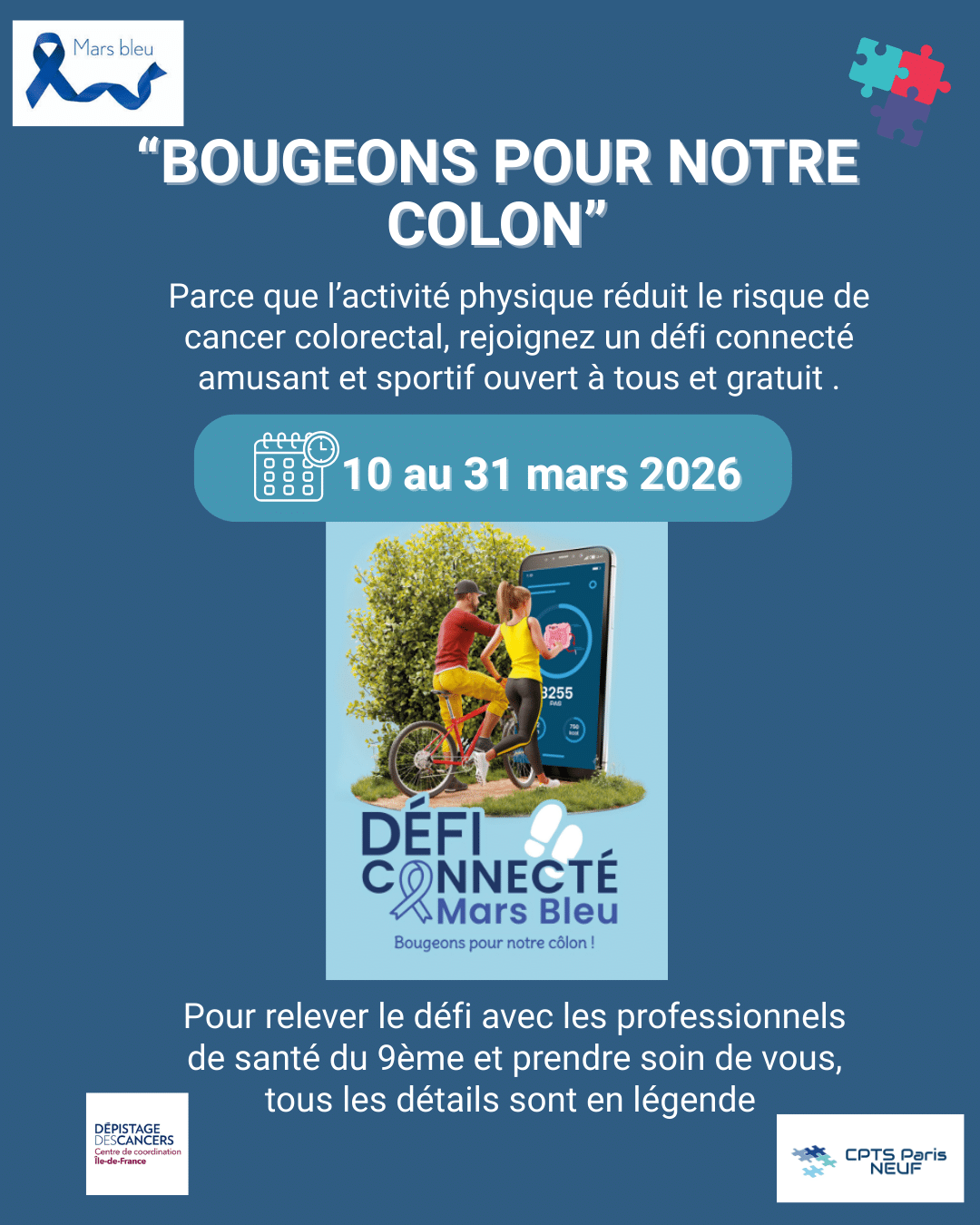 Mars Bleu 2026 : du 10 au 31 mars, la CPTS Paris NEUF s’associe au défi connecté « Bougeons pour notre côlon »