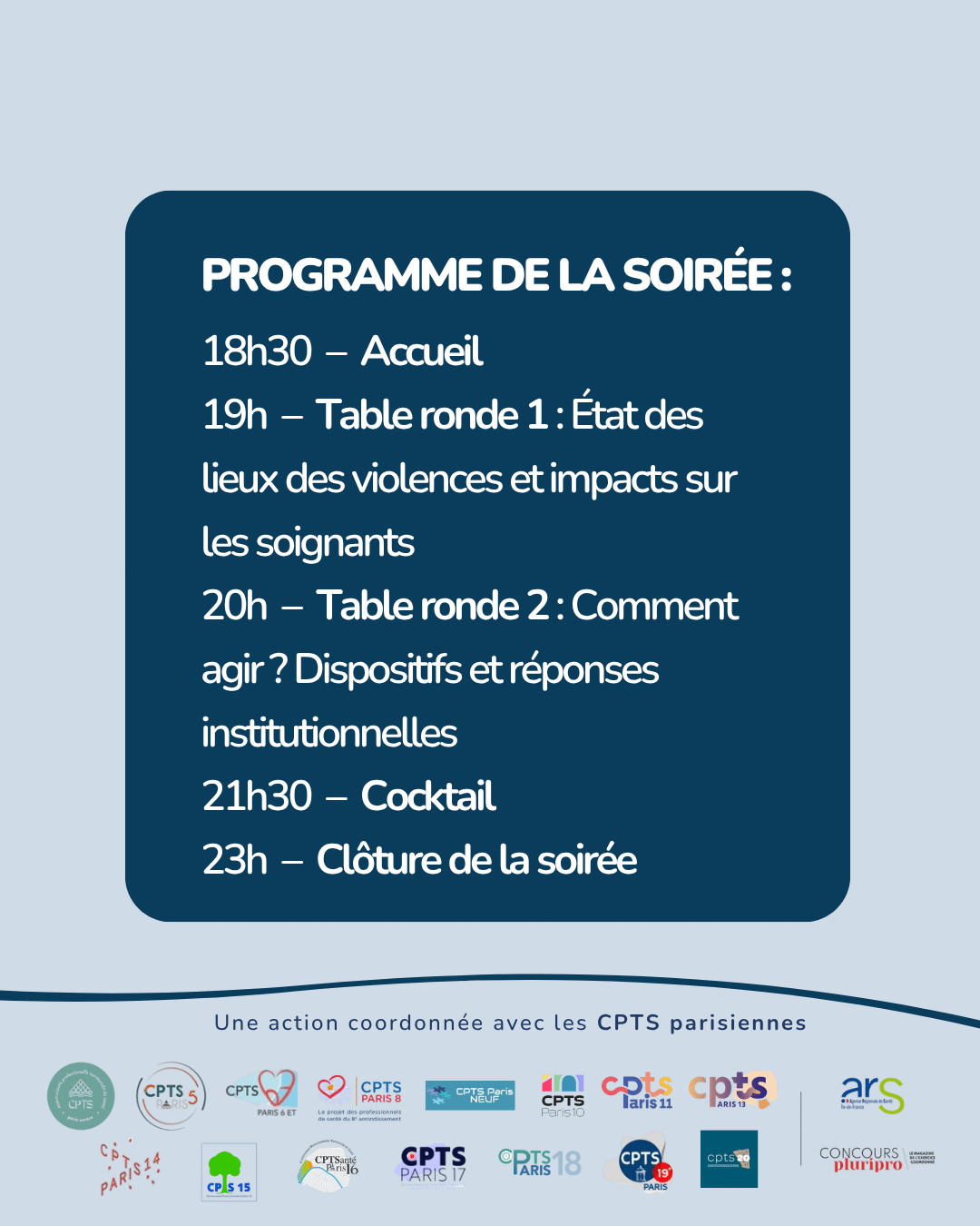 Dans la continuité des ateliers de sensibilisation organisés en avril, les CPTS parisiennes vous invitent à une soirée d’échanges et de mobilisation autour des violences envers les professionnels de santé.